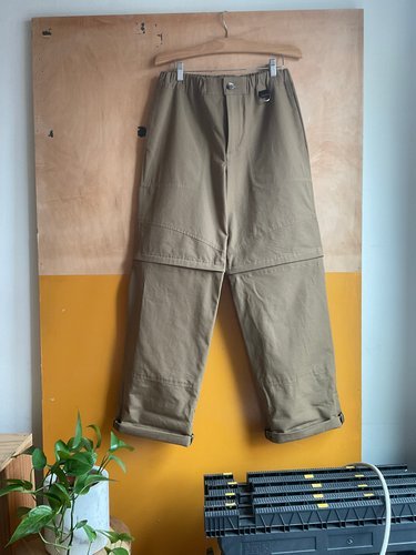 A convertible pant with elastic waistband and topstitching detail. Made from 100% cotton ripstop fabric. Seam allowances at the inseam and outseams are bound with contrast poly ripstop tape. Created for my capstone collection in FIT’s Menswear Design program.