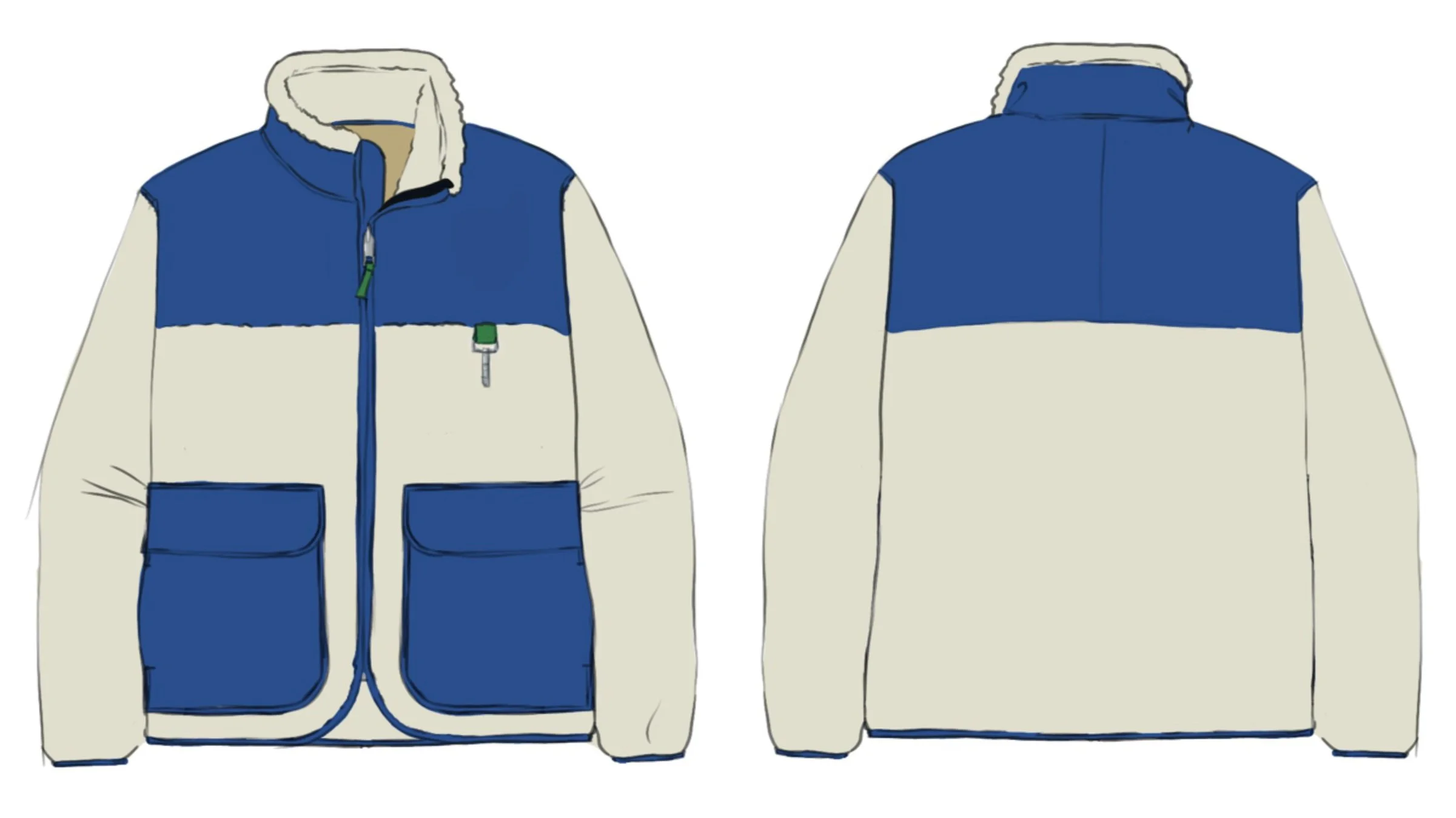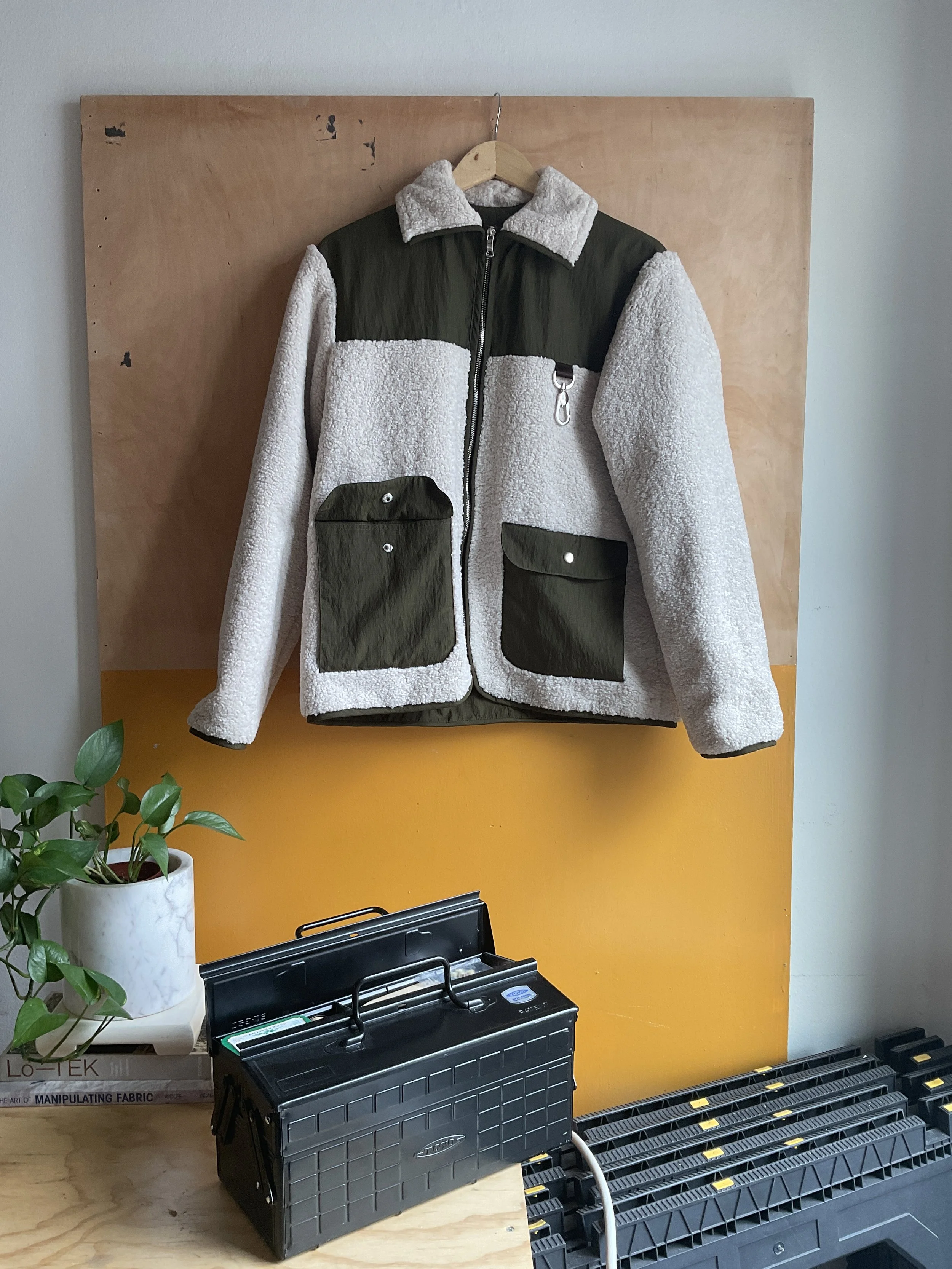 A sherpa fleece jacket with nickel trims and contrast ripstop yoke, pockets, and lining. Created for my capstone collection in FIT’s menswear design program. Hip pockets have open sides for keeping hands warm, as well as top flaps for carrying small items.